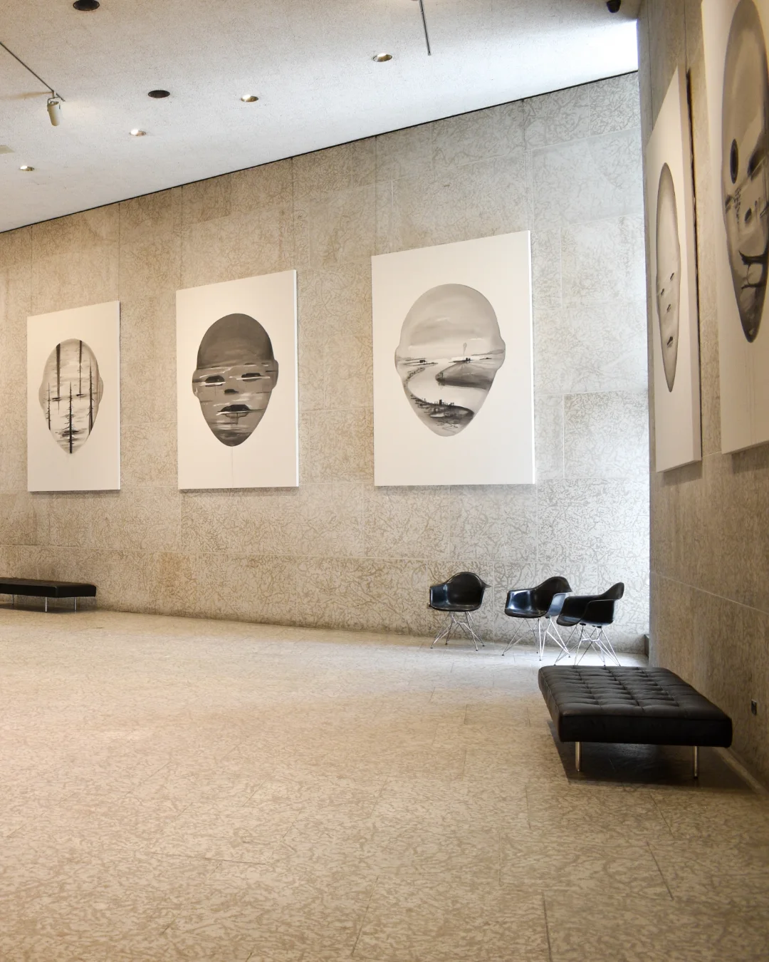 The robot-like heads, stark and expressionless, fill the space. But it’s what’s inside them that tells the real story: grim, natural landscapes sealed behind a grey filter.